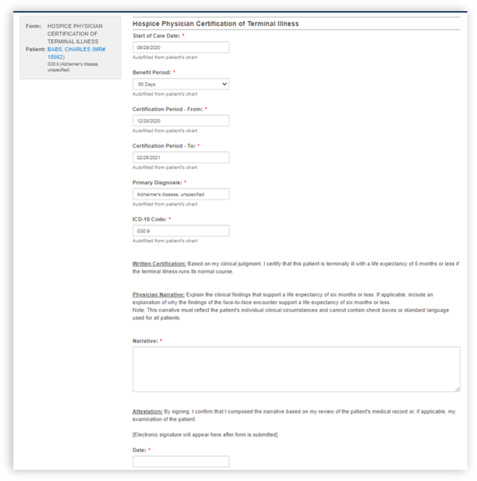- The Hospice Physician Certification of Terminal Illness where the physician, based on the nurses narrative, confirms and signs off on this prognosis and officially admits the patient into hospice.